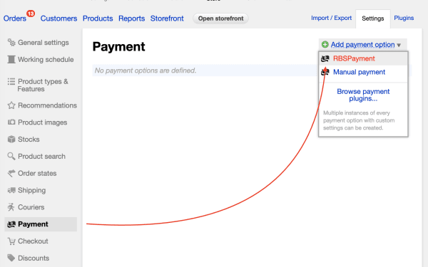- Sign in to Webasyst administrative panel. Select "Store", and at the top right-hand corner click on Settings. In the side menu on the left, select Payment>Add payment option.