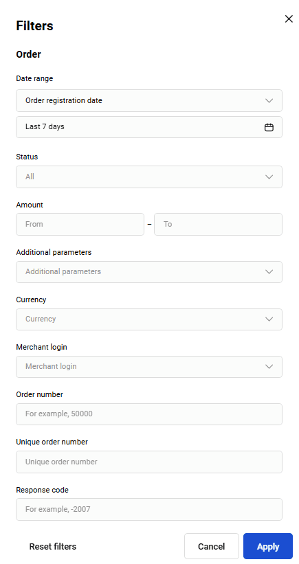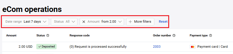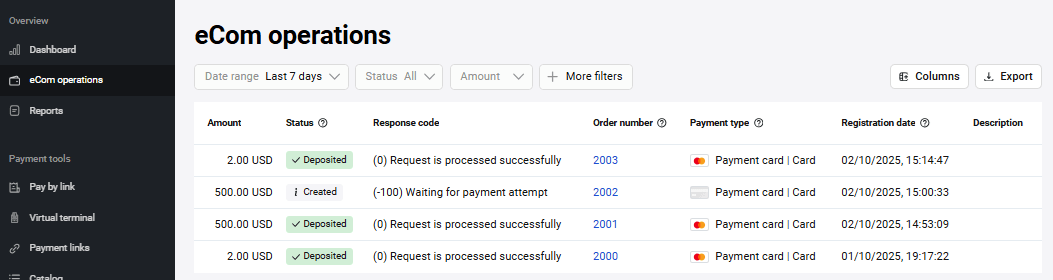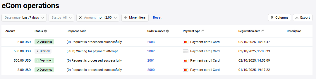 | Response code | A numeric code of a result received from a processing bank (action code). See the list of action codes here. |