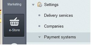 - Sign in to Webasyst administrative panel. Select "Store", and at the top right-hand corner click on Settings. In the side menu on the left, select Payment>Add payment option.