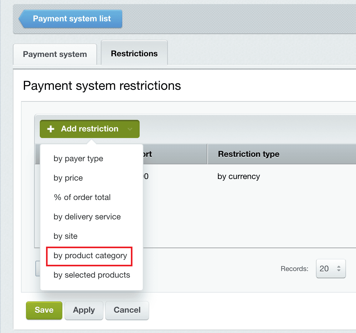 You can set restrictions on displaying the configured payment method on the customer's page, depending on the product category. The payment method will be displayed only if the product cart contains a product from the specified catogories. To do this: