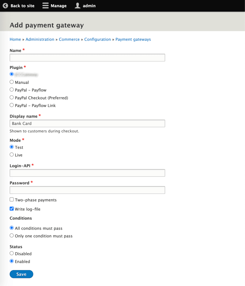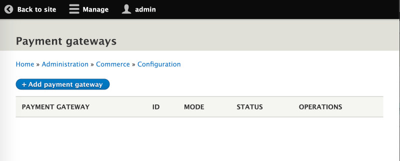 - Log in to your site as administrator and select Administration > Payment methods.