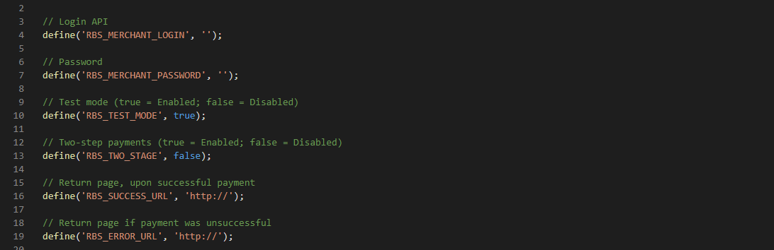 | RBS_TEST_MODE | Possible values: true, false.Defines whether the plugin works in test mode ( true) or production mode (false).Note that login and password for test and production may differ. |