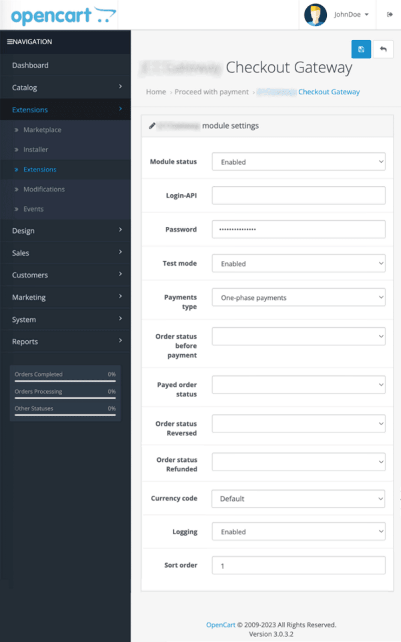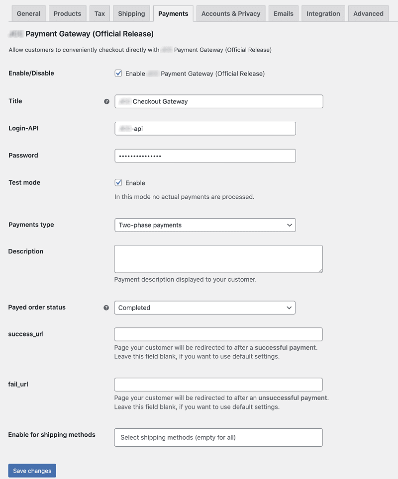 To start accepting payments on the site, enter Login-API and Secret for order signature. These were issued to you when you registered with the payment gateway.