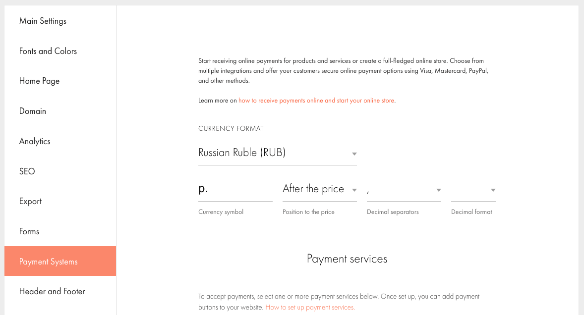 Open the Tilda projects page. Select the project (site) to which you want to add a payment system. Next, select Site Settings and open the Payment Systems tab.