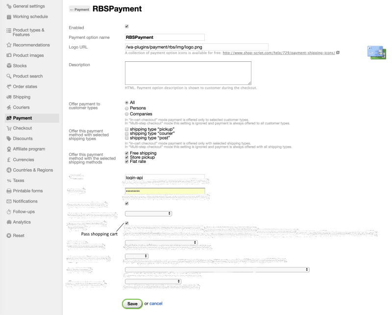 | Offer this payment method with selected shipping types | Setting that governs for what shipping types the checkout option provided by the plugin will be available for |