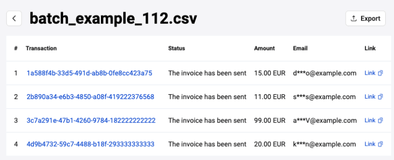 To view the content of the processed batch file, go to the Pay by link section, open the Multiple tab and click on the line of the uploaded file. A page opens with the details for each invoice.