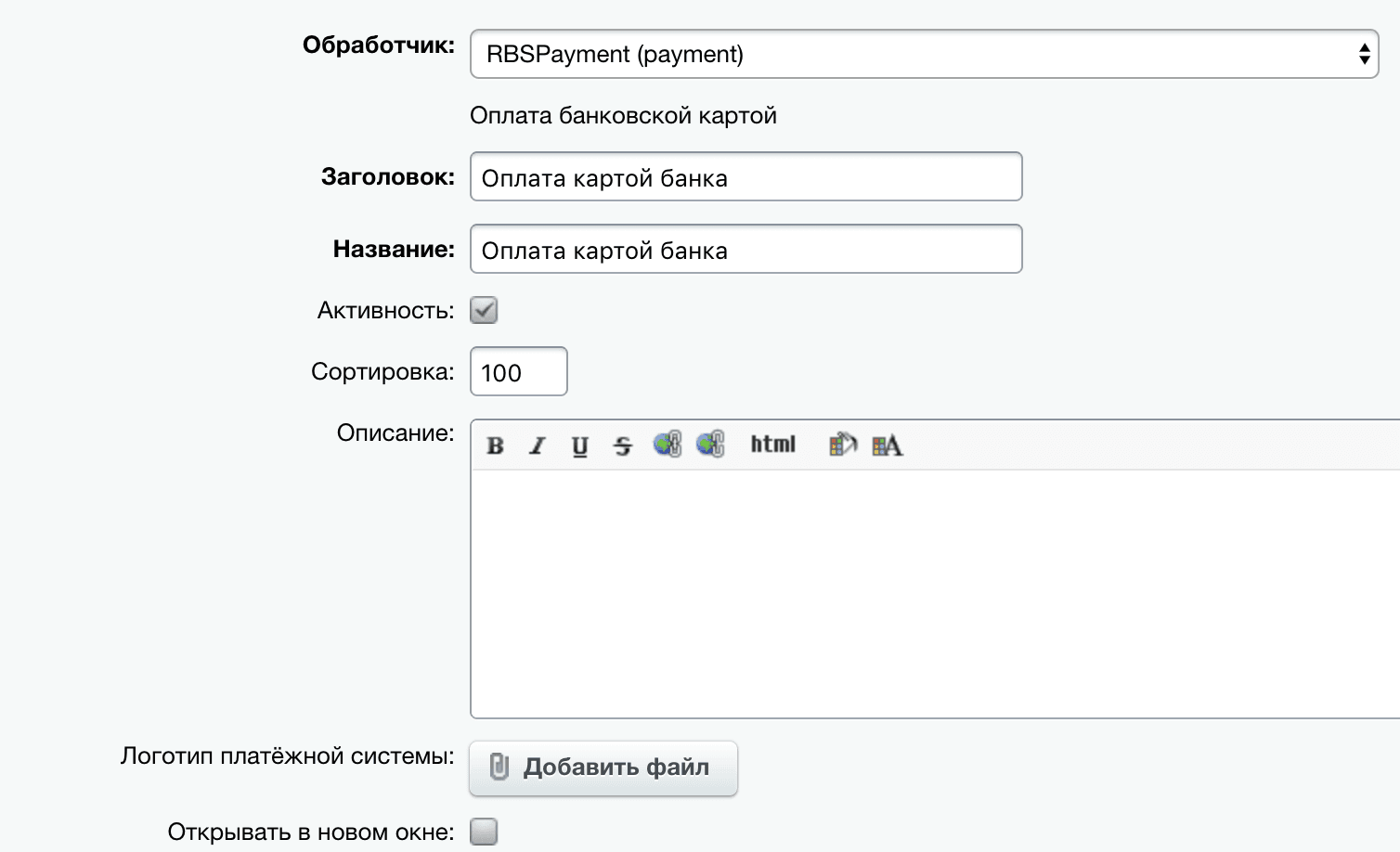 Введитеrbspayment_<имя банка>в поле Класс-обработчик — здесь <имя банка> должно быть указано так же, как в названии архива (при необходимости уточните у службы технической поддержки). Обязательно установите флажок Включен, чтобы активировать способ оплаты. - Нажмите Сохранить.