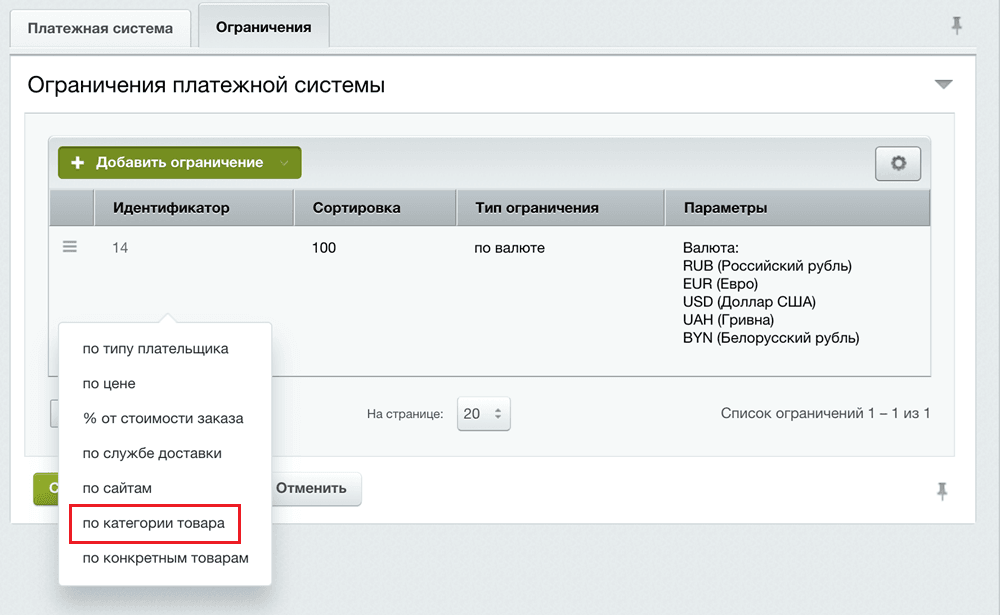 Вы можете выставить ограничение на отображение настроенного способа платежа на странице покупателя в зависимости от категорий товаров. Способ платежа будет отображаться только в том случае, если в корзине есть товар из указанных категорий. Для этого: