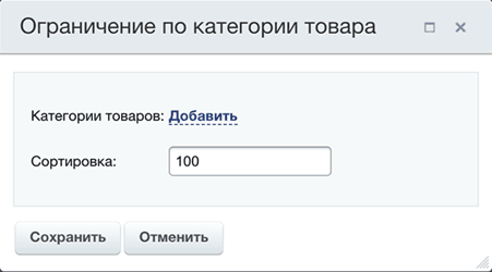 | Категории товаров | Нажмите Добавить, чтобы выбрать нужные разделы каталога товаров. |