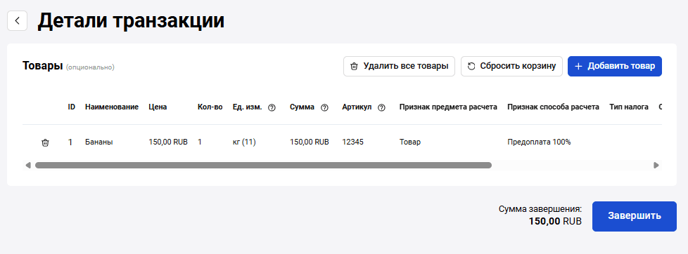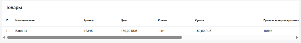 Секция Товары содержит информацию о том, какие товары или услуги оплачены в рамках транзакции.