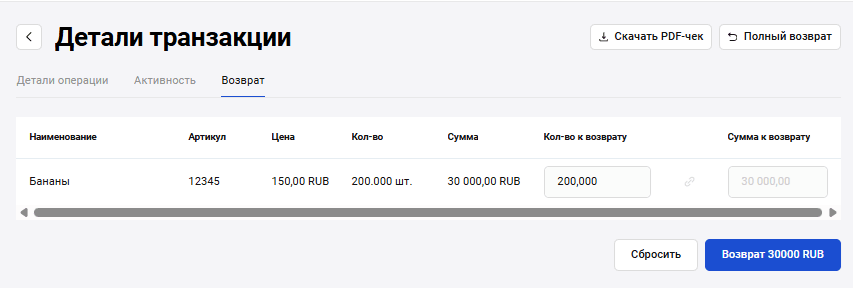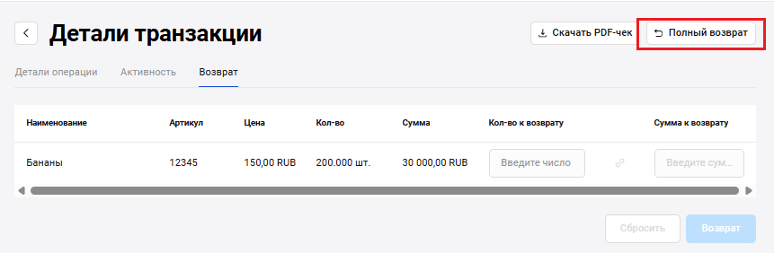 Чтобы отменить платеж, на странице информации о транзакции нажмите кнопку Возврат.