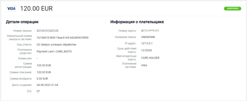 | Код ответа | Цифровой код результата, полученного от процессинга банка (action code). См. список кодов ответа здесь. |