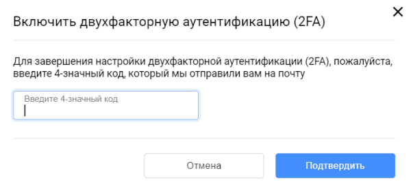 Вы можете настроить двухфакторную аутентификацию, чтобы обеспечить дополнительный уровень безопасности, гарантирующий, что только вы сможете иметь доступ к вашему Личному кабинету. В этом случае при входе в Личный кабинет необходимо ввести не только логин и пароль, но и код аутентификации, сгенерированный приложением Google Authenticator, либо отправленный на вашу электронную почту (в зависимости от включенного способа аутентификации).