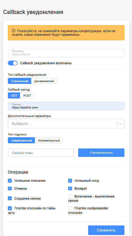 Дополнительная информация об уведомлениях обратного вызова доступна здесь. Вкладка Callback-уведомления доступна здесь: Настройки → Продавец → Callback-уведомления.