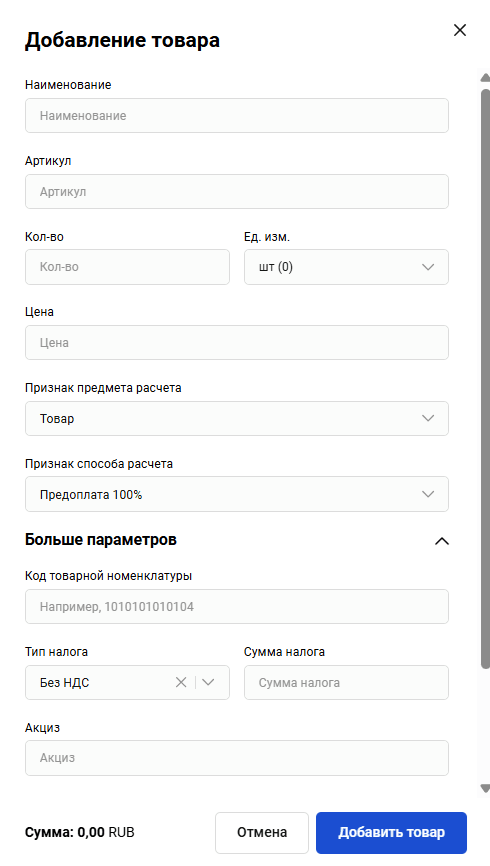 Поле Описание Наименование Наименование товара или услуги. Обязательное поле. Артикул Артикул товарной позиции. Обязательное поле. Кол-во Количество товара по данной товарной позиции. Обязательное поле. Ед. изм. Единицы измерения, например: л — литры, шт. — штуки. Обязательное поле. Цена Цена за единицу товарной позиции. Обязательное поле. Сумма Общая сумма за все единицы одной товарной позиции. Высчитывается автоматически при заполнении полей Цена и Кол-во. Нажмите Добавить товар.